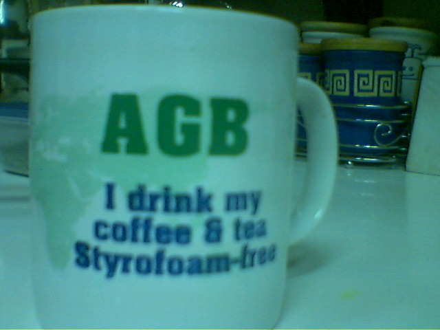 my father drink his coffee styrofoam-free!! i don't know what the hell does that mean! |